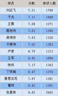 本輪爲泰達球員打分中:得分最高爲佐裏奇(8.62分,2442人蔘與投票),得分最低爲丁祥瑞(6.47分,1374人蔘與投票)。