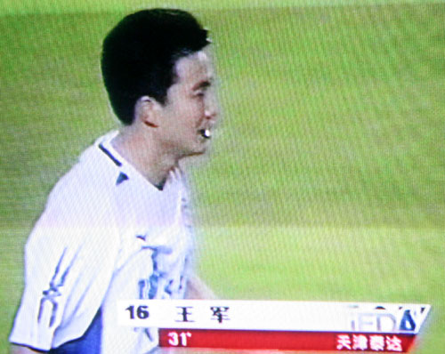 第31分鐘,天津隊前場獲得任意球,老將王軍大力攻門,對方門將撲球脫手,球從胯下滑進球門。天津隊暫時領先