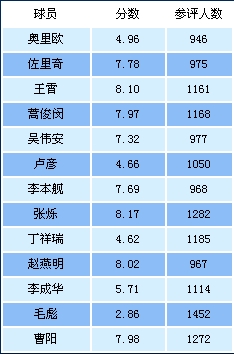 本輪爲泰達球員打分中:得分最高爲張爍(8.17分,1282人蔘與投票),得分最低爲毛彪(2.86分,1879人蔘與投票)。