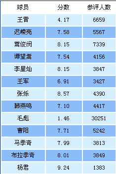 本輪爲泰達球員打分中:得分最高爲楊君(9.24分,1383人蔘與投票),得分最低爲毛彪(1.46分,30251人蔘與投票)。