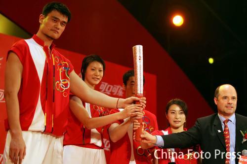 7月4日消息,昨天,姚明和趙蕊蕊、王勵勤、郭晶晶一起出席了可口可樂公司組織的奧運火炬手提名啟動儀式。手持火炬出現在眾人面前的姚明儼然成了中國最高的『奧運火炬手』。不過這位『最高的火炬手』卻不太敢想象自己能成為點燃主火炬的『最後的火炬手』。