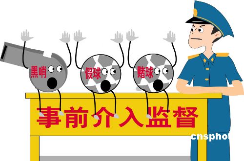 漫畫:公安部首次監督『假球、賭球、黑哨』。去年8月26日,公安部派員赴南京現場觀看中甲聯賽比賽,首次『事前介入』中國足壇,監督『假球、賭球、黑哨』。龔建人說,只有司法介入,中國的足球環境纔能改善,那些循規蹈矩的足球投資人的利益纔能得到保障。據悉,今年4月,國務院辦公廳下發了《關於做好2006年足球比賽有關工作的意見的通知》。這是自1994年中國足球職業聯賽開始以來第一次以國務院辦公廳的名義向全國各相關部門發布的就維護職業聯賽、整頓賽場秩序的通知。中新社發中中攝