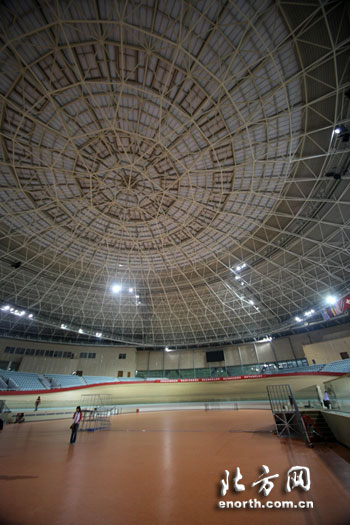 該館建築面積33320平方米,地上分成三層,建築高度為33.8米,賽時可容納觀眾6000人,其中3000是臨時的座席。走進場館,頭頂為巨大的如蜘蛛網般的鋼結構圓形穹頂,穹頂周圍分布著200餘盞照明燈,250米長橢圓形全天候木質賽道橫臥在底部,賽道周圍是一排排整潔的淡藍色座席。
