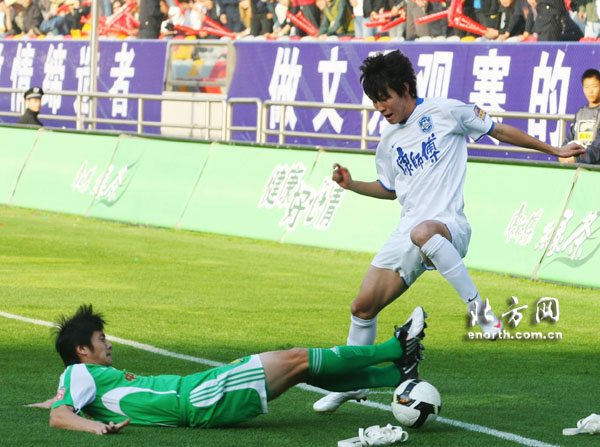 隨著韓國籍主裁金東鎮哨聲一響,比賽正式開始。下午的天津陽光明媚,泰達大球場的一半都被陽光索籠罩。對於習慣也夜場的雙方,或許這樣耀眼的光讓人有些不適。比賽開始的前兩分鍾裡,雙方都顯得有些謹慎,進攻上投入的兵力不多,只是試探性的投入少許人力。第三分鍾是,杜文輝完成了本場比賽的第一次射門,由於沒有用上力量,球被楊君輕松截獲。隨著比賽的逐漸深入,在進攻上雙方開始嘗試投入更多的人力。
