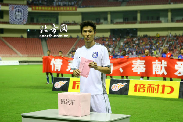 在比賽開始前,雙方球員打出橫幅,為舟曲災區加油祝福!而更加令人感嘆的是,在賽前,兩隊球迷似乎非常和諧,他們竟拋開了賽前關於『陳濤能否代表泰達出戰申花』的口舌之爭,一起喊出了『國安XX』這樣相同的四字口號為兩隊加油。