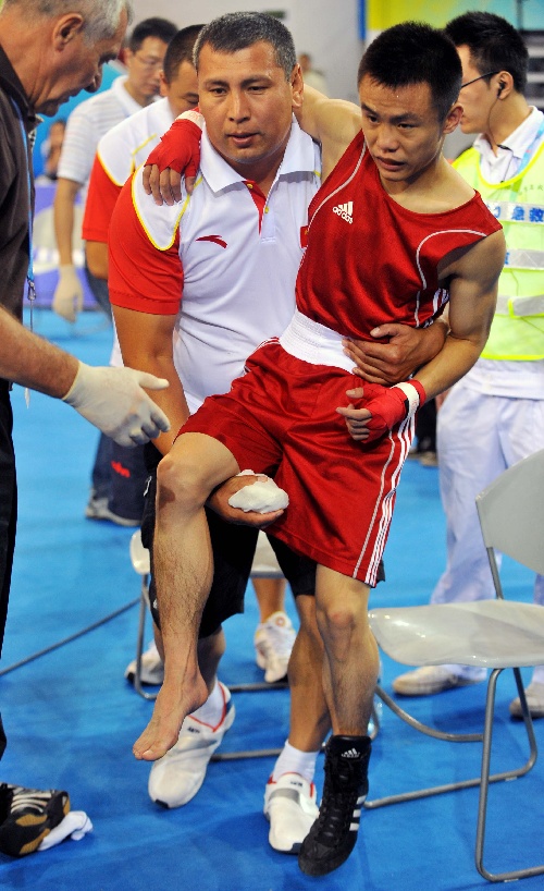 北京,2010年9月1日(武搏會)(1)中國選手李超受傷退賽9月1日,中國選手李超在受傷後離開賽場。當日,李超在北京武搏會拳擊52公斤級半決賽中因傷退賽。新華社記者馬寧攝(責任編輯:王燕芳)