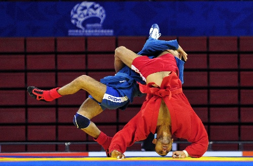 9月3日,戴米爾·木西多夫(右)與埃米爾·哈桑諾夫在比賽中。當日,在2010年北京首屆世界武搏運動會桑搏男子68公斤級第一輪比賽中,烏茲別克斯坦選手戴米爾·木西多夫以2比0戰勝阿塞拜疆選手埃米爾·哈桑諾夫。