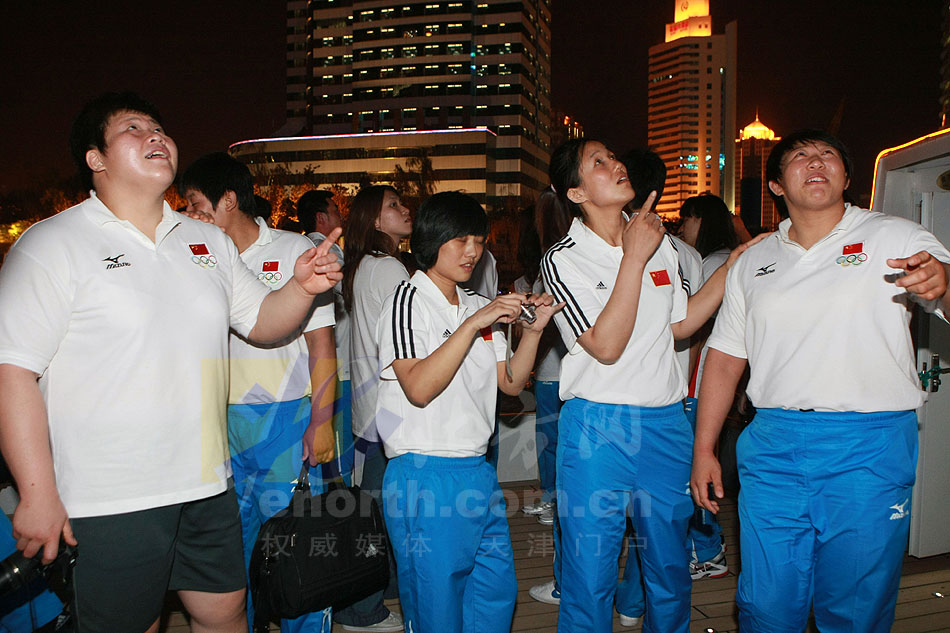 8月2日晚,數十名天津體育明星乘坐遊船遊覽了天津海河。陳一冰、佟文、王鑫3位奧運冠軍,以及新科世錦賽跳水冠軍汪皓等運動員,親身感受了母親河的美景。(攝影劉欣)