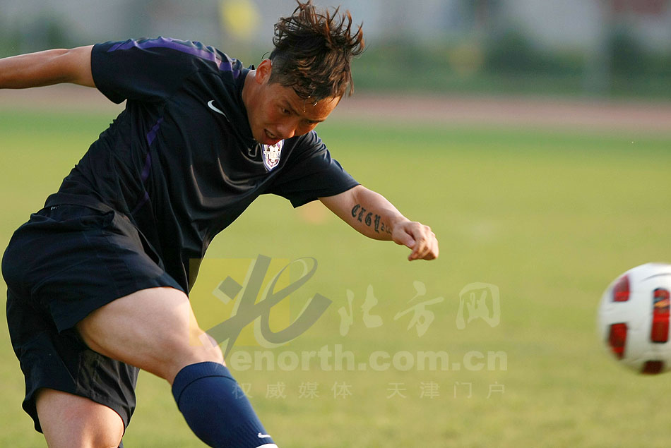 8月3日傍晚,天津泰達隊在水滴外場進行了公開訓練,備戰即將與西班牙皇家馬德里隊進行的友誼賽。比拉斯科的凌空爆射技驚四座,博得一片掌聲。(攝影劉欣)