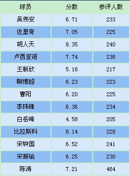 天津北方網訊:截止至9月20日13:00,在2011賽季中超聯賽第24輪天津泰達隊主場2:2戰平杭州綠城的當輪“球迷爲天津泰達康師傅隊打分”的活動中,登場亮相的13名球員在比賽中爲泰達隊打入扳平一球的小將胡人天以8.35分當選本場最佳。其他出場球員由高到低依次爲:比拉斯科(8.14)盧西亞諾(7.74)陳濤(7.21)佐裏奇(7.05)吳偉安(6.71)宋鍾國(6.52)李瑋鋒(6.36)宋振瑜(6.25)聊博超(6.23)曹陽(6.20)王新欣(5.18)白嶽峯(4.58)