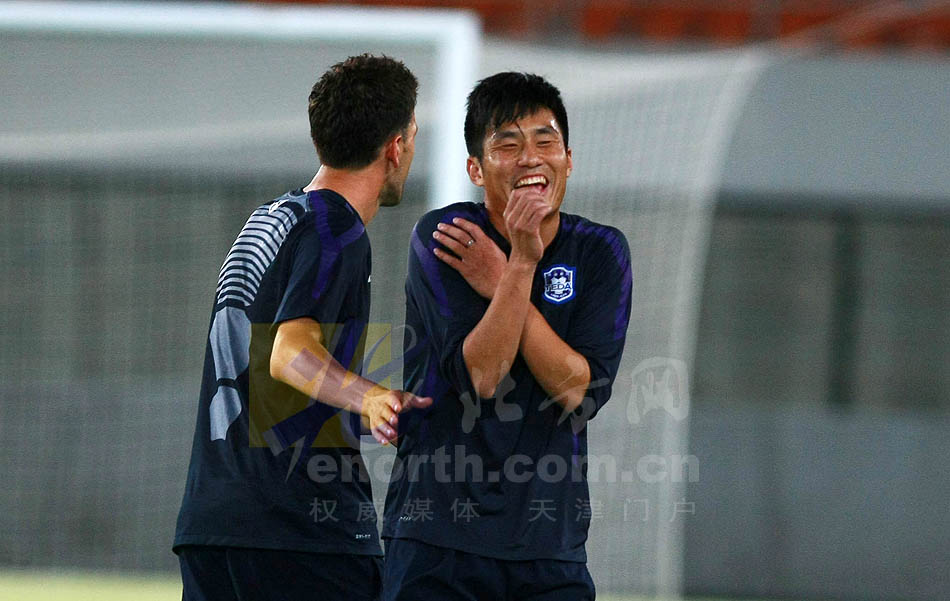 9月23日晚,天津泰達隊在廣州天河體育中心體育場進行了賽前踩場訓練。陳濤因傷未能隨隊出征,而比拉斯科在訓練中也舊傷復發(攝影 劉欣)