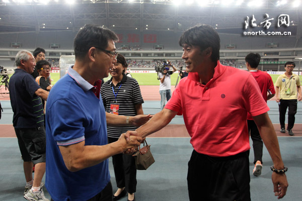 天津北方網訊:北京時間8月26日,2012賽季中甲聯賽展開焦點爭奪,上海特萊士和天津松江的聯賽焦點對陣中,最終經過90分鐘的較量,上海隊憑藉汪佳捷、武磊和呂文君的進球,3:0戰勝客場作戰的松江隊。賽後,東亞俱樂部主席徐根寶從主席臺走入場內,向歡呼的上海球迷深深鞠躬致意,並認真熱情的鼓勵松江少帥郝海濤。對於目前的聯賽衝超形式,徐根寶坦言:“還有七場球兩支球隊都有希望,我剛纔也跟海濤講,後面比賽把握好了都有衝上去的可能和機會。”