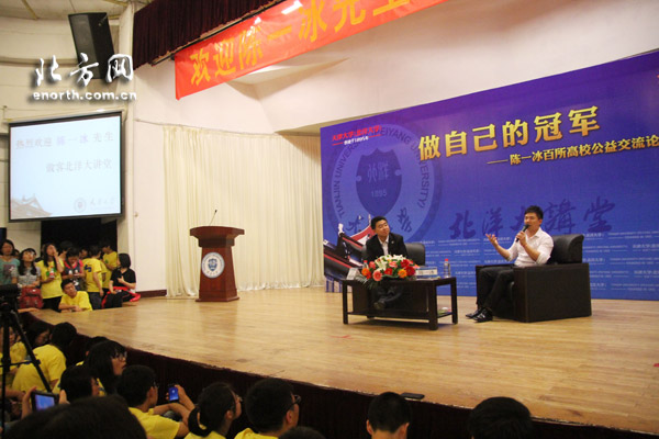天津北方網訊:5月23日晚,陳一冰“做自己的冠軍”全國百所高校公益交流論壇在天津大學舉行。國家體操隊男隊隊長、奧運冠軍陳一冰同天大師生一同分享了他在成功路上的個人心得體會,與莘莘學子面對面交流,傳遞“奮鬥不息、勇攀高峯”的自強精神。