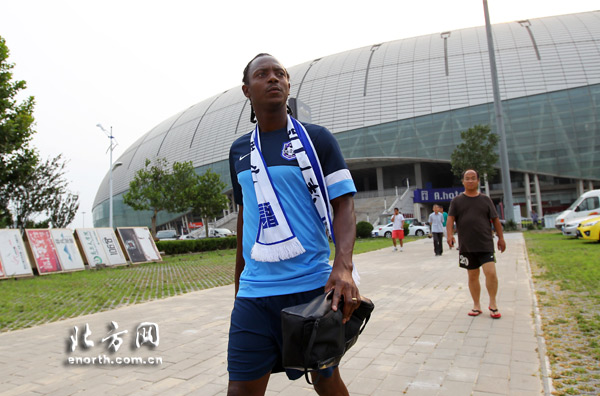 按照訓練計劃,泰達隊昨天(4日)17時在“水滴”外場進行了與上海申花隊賽前的最後一次常規訓練。還沒走到訓練場門口,“奇鳥”便受到了球迷們的歡迎。一位球迷將一條泰達隊的圍巾戴在了他的脖子上,“奇鳥”不住地說着“Thank you”。對於球迷簽名和合影的要求,他也微笑着一一滿足。他甚至還主動與一名有些害羞的小球迷合影,顯得相當具有親和力。