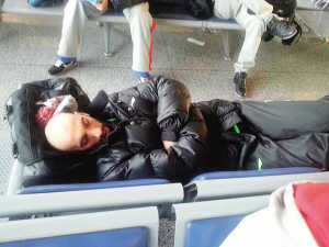 等飛機更加不用說了,見到椅子就直接躺倒,睡到大家都登機他也紋絲不動,每次他都要等到機場廣播喊,他纔會慢慢睜開惺忪的睡眼,通常都是他前腳登機,後腳飛機就關閉艙門。這已經是大家見怪不怪的了,但他不挑地方的隨意睡最近似有升級趨勢,前不久從成都飛北京時,球隊在機場辦理登機、托運行李,這麼一會兒工夫,“睡神”阿巴斯竟然還要躺在隔壁的行李傳送帶上眯一覺,本來趕早班機,大家都哈欠連天,結果這一“奇景”讓其他隊員全部醒盹,大家紛紛上前拍照,一時間微信朋友圈中滿屏盡是阿巴斯。“特困生”的名字也就徹底在阿巴斯身上坐實了。