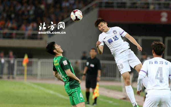 北京時間2014年5月3日19:35,2014賽季中超賽季第10輪,泰達隊主場迎戰北京國安。圖爲精彩瞬間。