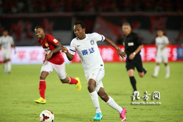 北京時間2014年8月16日20:00,2014賽季中超賽季第21輪,天津泰達客場挑戰廣州恆大。圖爲精彩瞬間。