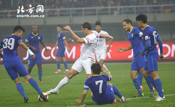 北京時間2014年10月19日19:35,2014賽季中超賽季第28輪,泰達隊主場迎戰大連阿爾濱。圖爲精彩瞬間。