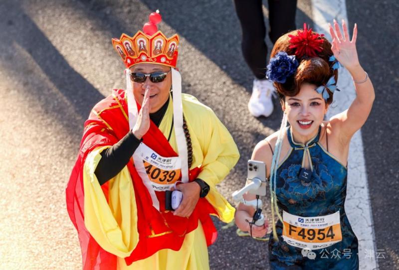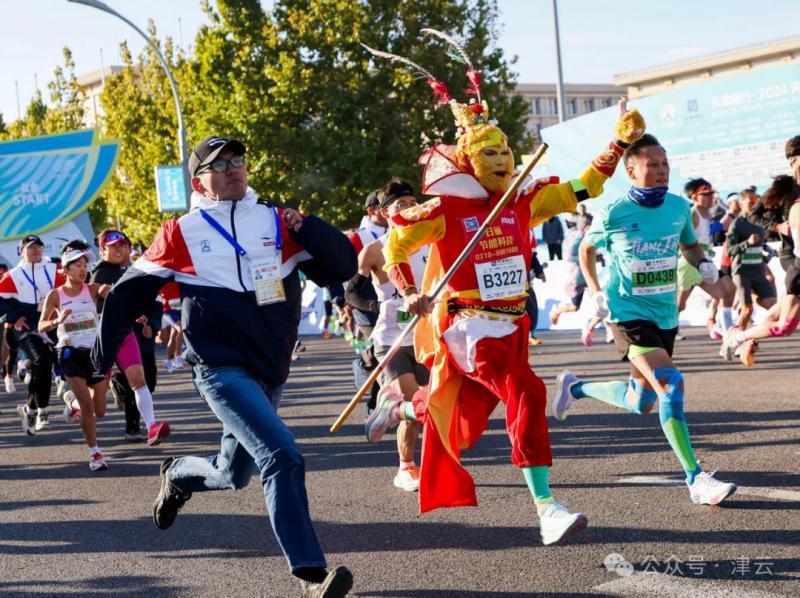 2023年天馬賽道旁,一位天津市民給參賽者遞煙的短視頻火了,許多外地網友感嘆天津人的幽默感和松馳感是發自骨子裡的。2024年天馬,同樣不缺少火遍全網的段子和網絡梗。無論是手拿金箍棒的黑神話悟空,還是跟隨關門兔一起到達終點的“兩只恐龍”,都不愧為顯眼包本包。