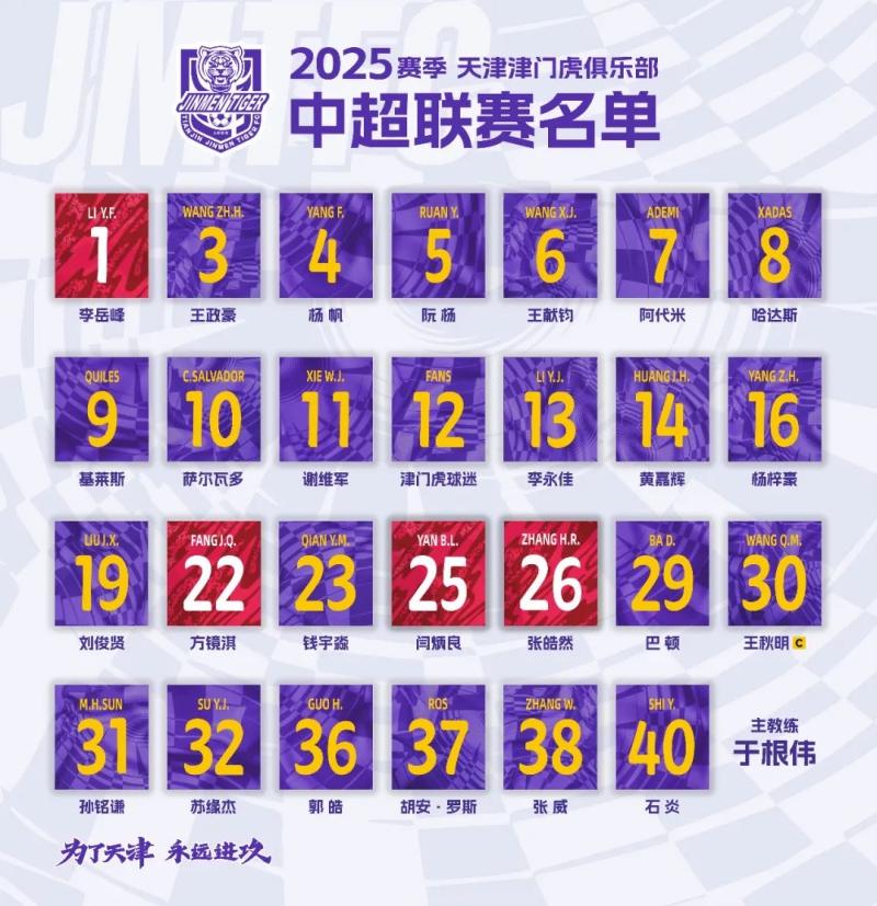 本賽季,津門虎隊進行了較大程度的人員調整,共引進3名外援和5名內援。外援方面,阿代米和哈達斯留隊,基萊斯、薩爾瓦多和胡安羅斯加盟球隊;內援方面,引進了楊帆、阮楊、李永佳、孫銘謙和張威,小將張皜然從梯隊昇入一線隊。同時,津門虎還與王秋明、巴頓等11名球員完成續約,球隊也將以全新的陣容出戰2025賽季中超聯賽。