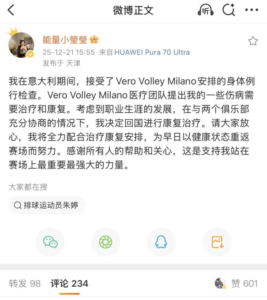 北京時間2025年12月21日下午,天津渤海銀行女排官方微博以及李盈瑩本人分別發表聲明,目前李盈瑩因為傷病問題已從米蘭返回天津,天津渤海銀行女排俱樂部將為李盈瑩安排最好的醫療和康復條件,確保她盡快恢復,早日重返賽場。